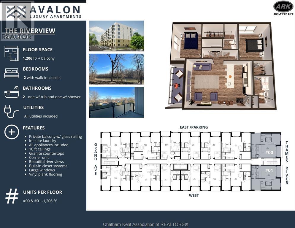 Welcome to the Avalon on Grand, where luxury meets convenience. Ark Built's newest offering in Chatham, a river view two-bedroom apartment, with the best views in the entire building. Boasting an impressive 10 ft ceiling, this unit offers an airy and open ambiance that is not found in other buildings. The modern kitchen is a chef's dream, featuring granite countertops and quality appliances that make cooking a pleasure. Step into the large bedrooms and discover walk-in closets, large windows and en-suite bathrooms. The private balcony, with glass panel railing, provides an exclusive outdoor retreat perfect for morning coffees or quiet evenings in the summer. Complete with in-unit laundry with front-load washer and dryer. Best of all, all utilities are included in the price, ensuring a hassle-free living experience. The Avalon on Grand redefines apartment living, offering unparalleled luxury and convenience. Nova Vida Cafe and bakery on the main level, with interior access for tenants. Gate controlled tenant-only parking. The ""Riverview"" model features the largest balcony - approx. 8 x 16ft - Last available Riverview model Showing blackout Sept 30 to Oct 13. (id:4555)