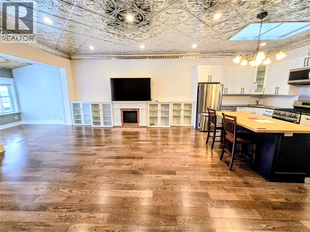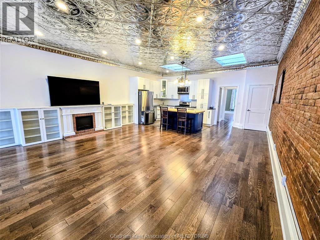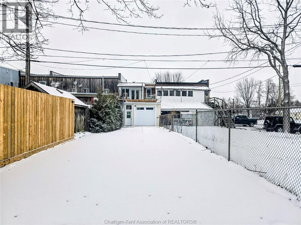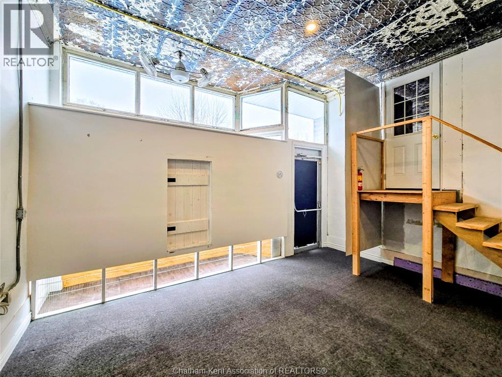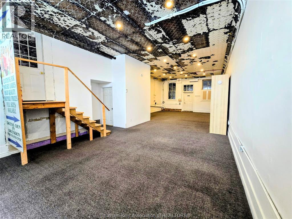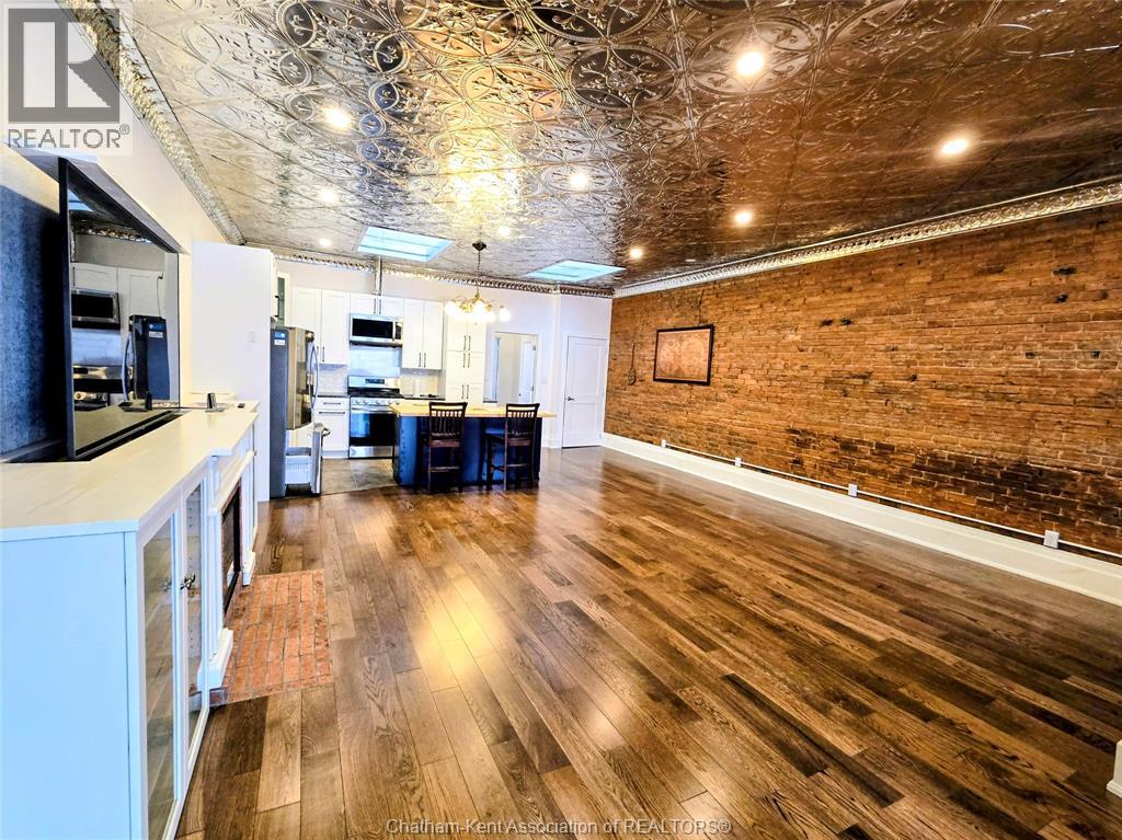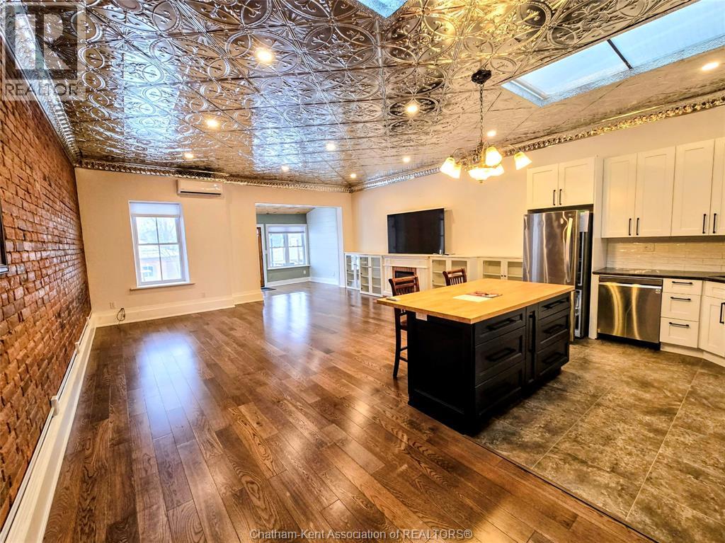 Welcome to 163 Main St in Downtown Dresden- A great investment with multiple opportunities for income potential!! The main floor offers a perfect commercial space (900 sq ft) in the heart of downtown with lots of natural light, charming original embossed tin ceilings and a 3 piece bathroom. A 20 x 21 heated garage (spray foamed walls/ceiling) sectioned off in the back adds an additional entrance plus garage door with plenty of outdoor parking (4+ spots). You could even turn this space into a second residential rental unit or utilize the main floor as a live/work opportunity. Although not currently being utilized a second, separate entrance from the front of the building could lead upstairs to the fully renovated and STUNNING residential unit (910 sq ft). This upper floor unit is absolutely breath taking with exposed brick, modern vintage inspired decorative tin ceiling with two fabulous skylights over the kitchen, and a large and bright living/entertainment space accompanied by a sunroom that leads to a spacious west facing balcony with rear entrance. All appliances in the kitchen/bath/laundry come with the building so you are set for success with separate meter capabilities for each floor. You don't want to miss this opportunity- set up a showing and make an investment towards your future today!! (id:4555)